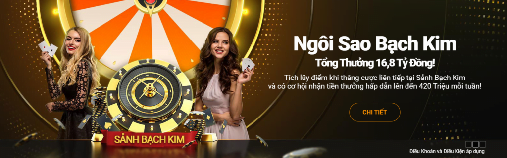 - Ngôi Sao Bạch Kim – Tổng Thưởng 16,8 Tỷ Đồng! - Tham gia đặt cược ngay tại sòng casino trực tuyến Sảnh Bạch Kim và tích lũy điểm để có cơ hội nhận tiền thưởng hấp dẫn lên đến 420 Triệu mỗi tuần!