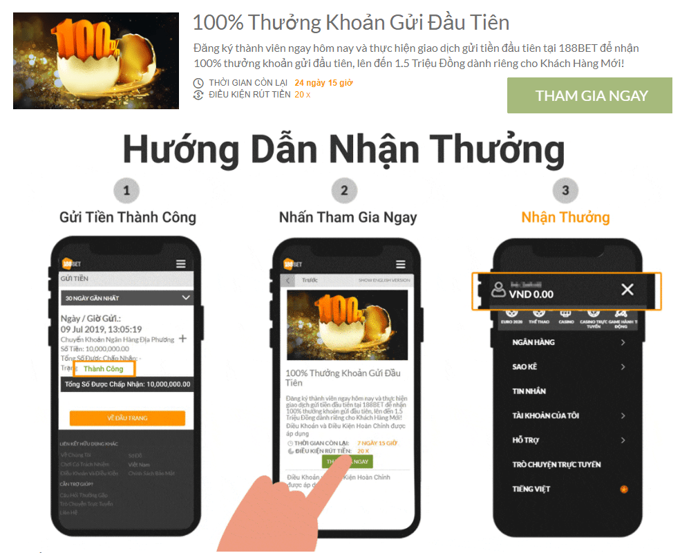 - 100% Thưởng Khoản Gửi Đầu Tiên - Đăng ký thành viên ngay hôm nay và thực hiện giao dịch gửi tiền đầu tiên tại 188BET để nhận 100% thưởng khoản gửi đầu tiên, lên đến 1.5 Triệu Đồng dành riêng cho Khách Hàng Mới!