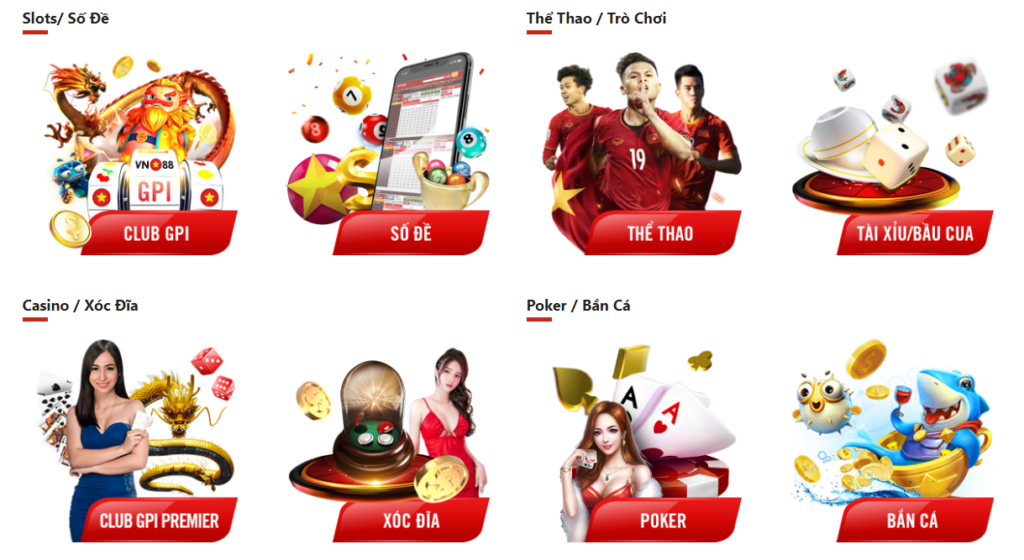 Baccarat, Rồng/Hổ, Xì Dách, Roulette, Sicbo (Xúc Xắc) và nhiều trò chơi hấp dẫn khác như Bài Tiến Lên, Bầu Cua Tôm Cá… Đặc biệt là tương thích với hầu hết các nền tảng hệ điều hành trên cả máy tính và phiên bản tải về trên thiết bị di động. Song song với việc tham gia cược trong Thể Thao hay Casino Trực Tuyến, chúng tôi còn cung cấp các sự lựa chọn khác cực kỳ đa dạng, dễ dàng tham gia và giành chiến thắng như như các trò chơi tại Slots hay Xổ Số.
